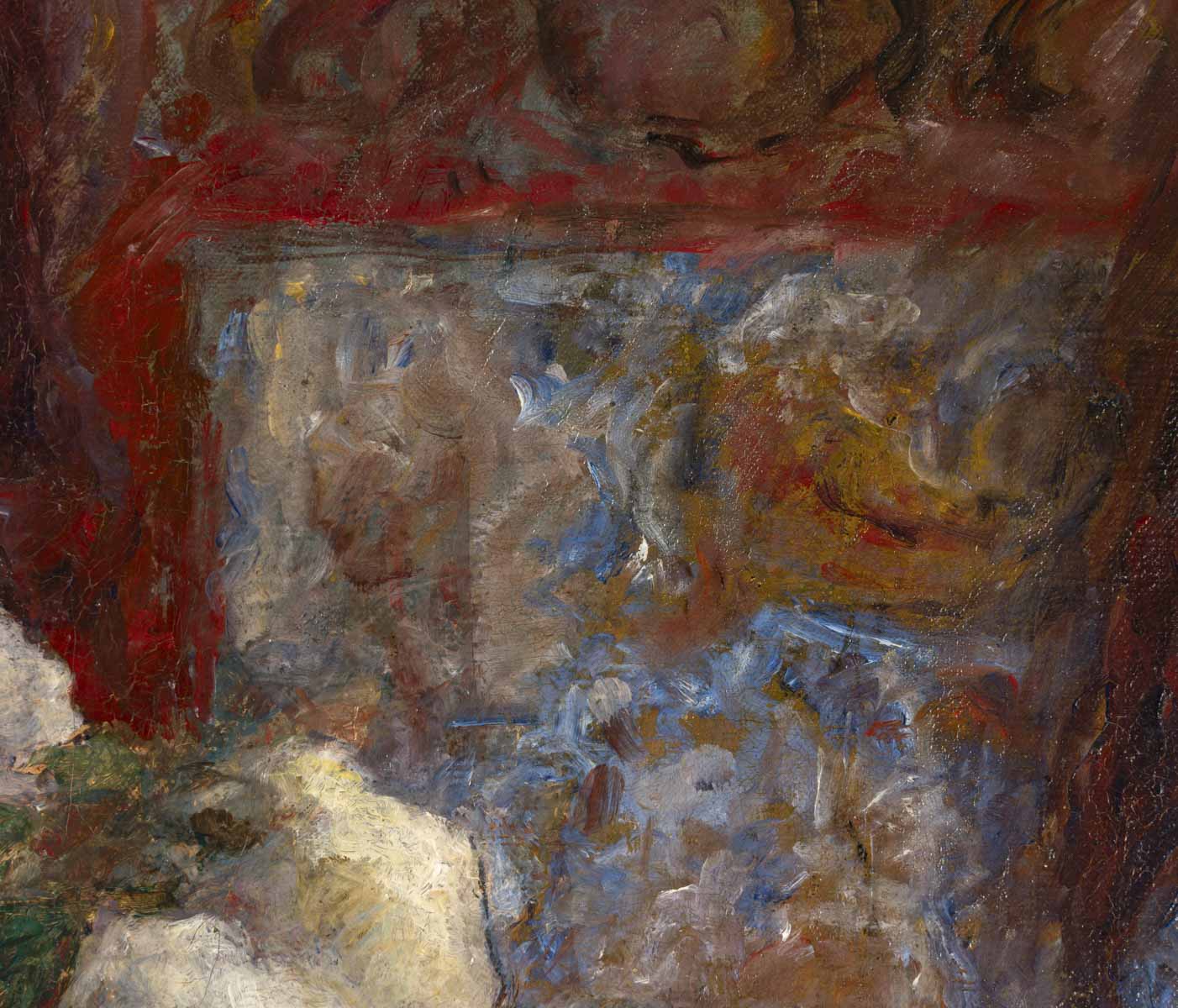 He uses the elements of the decor – the curtain in the background, the vase, the tablecloth on the table – to work his materials and colors in harmonious disorder.