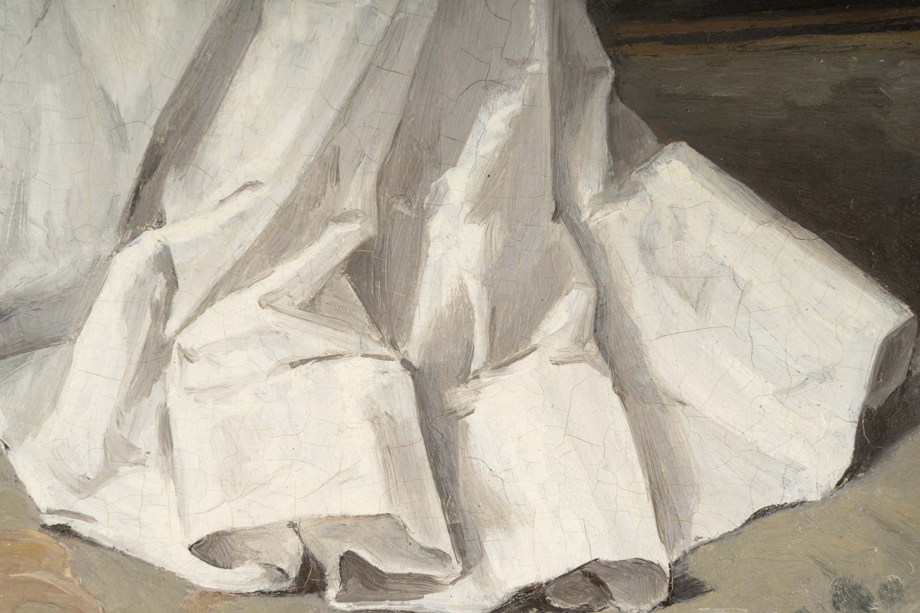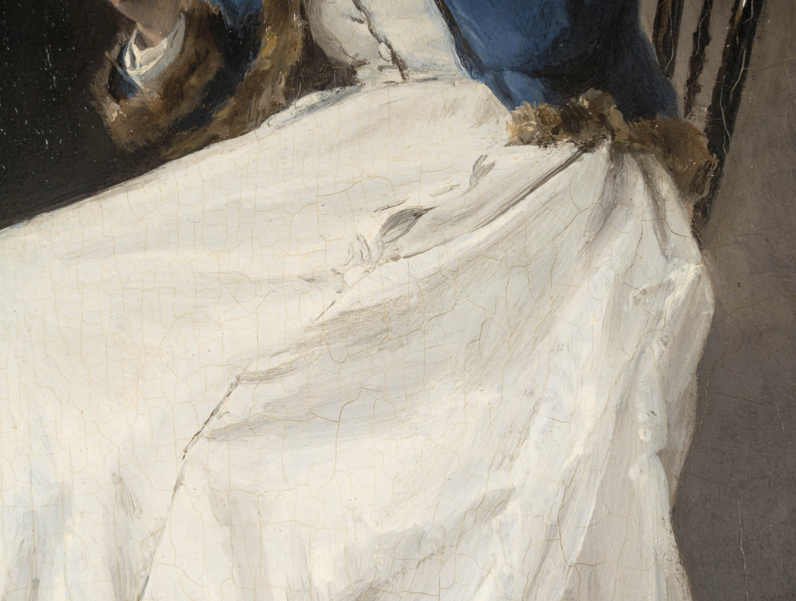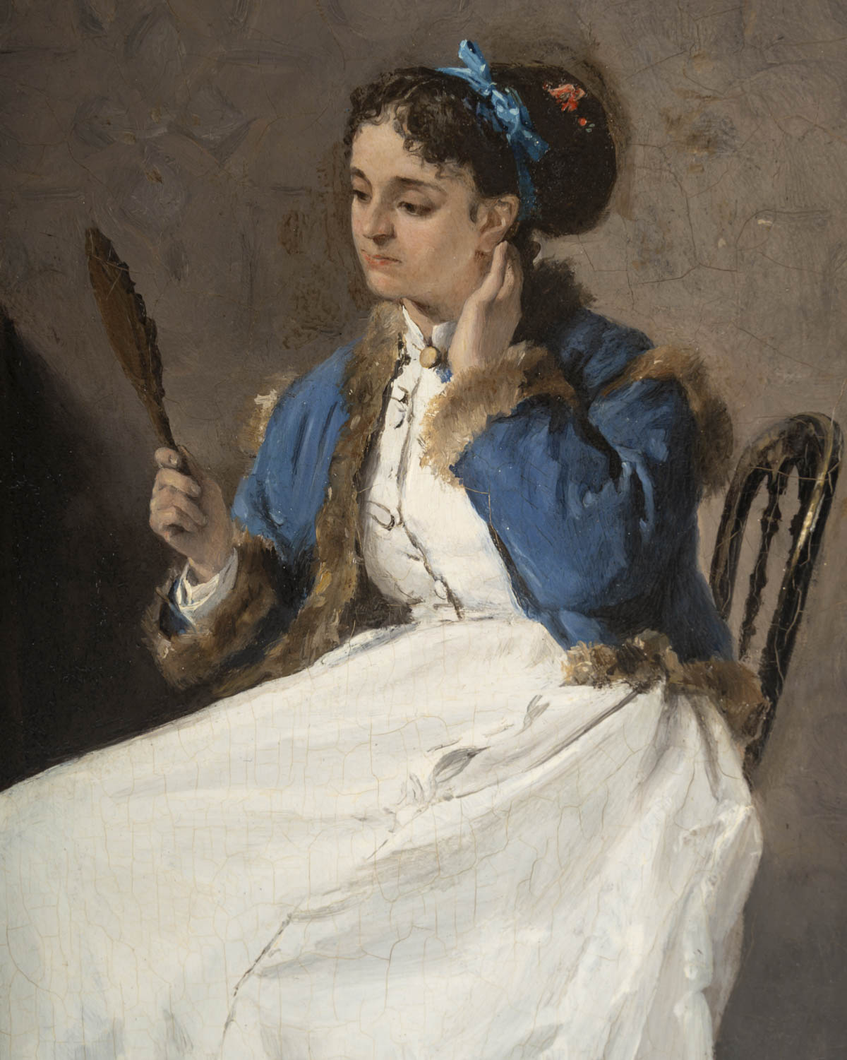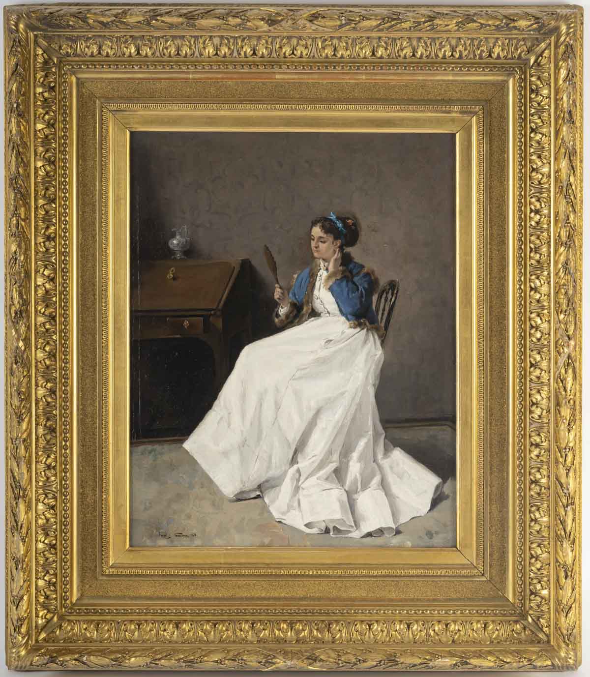 Henri-René Gaume portrays an elegant woman looking into a mirror. Her immaculate white dress, with its structured pleats, illuminates the scene.