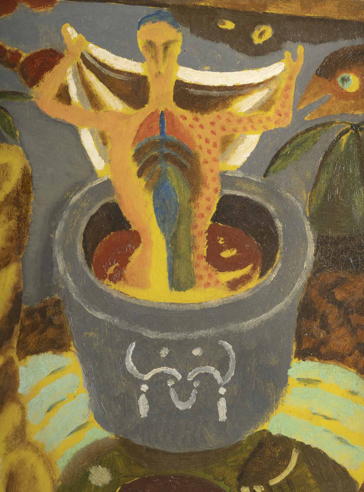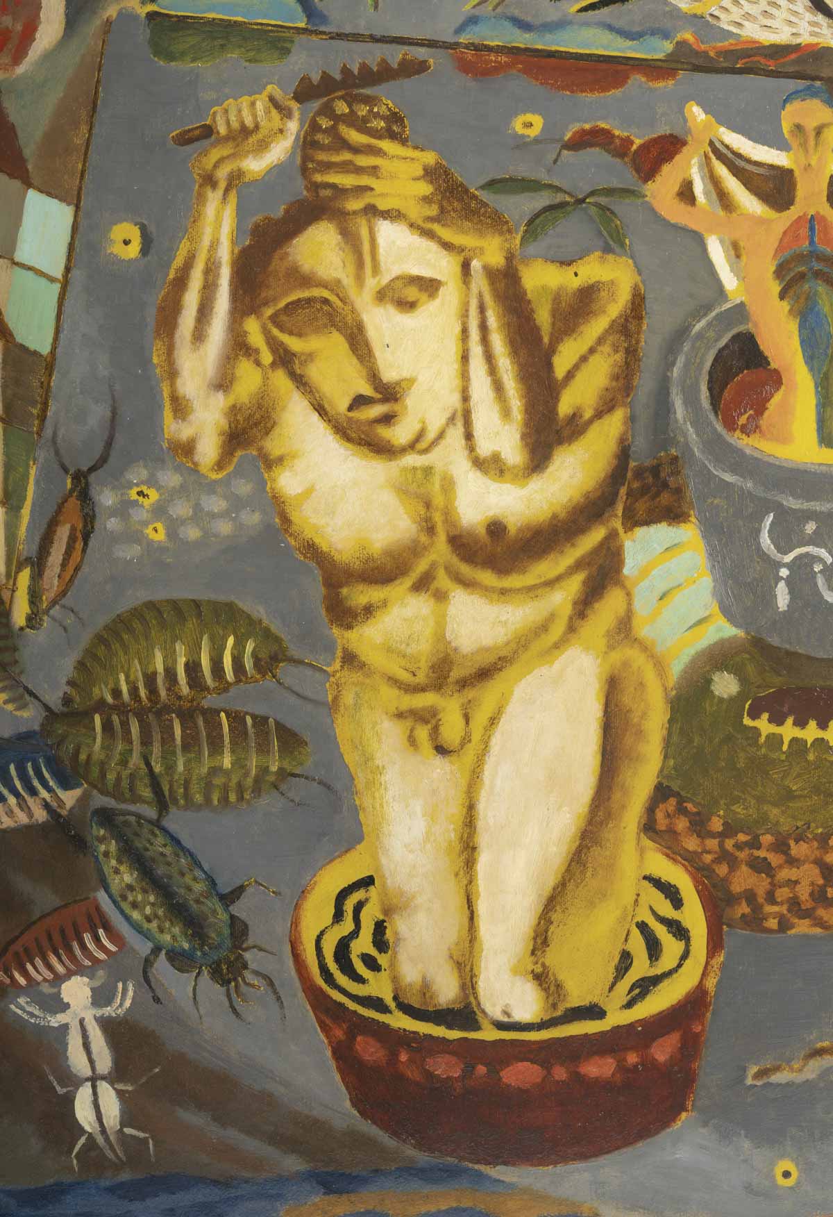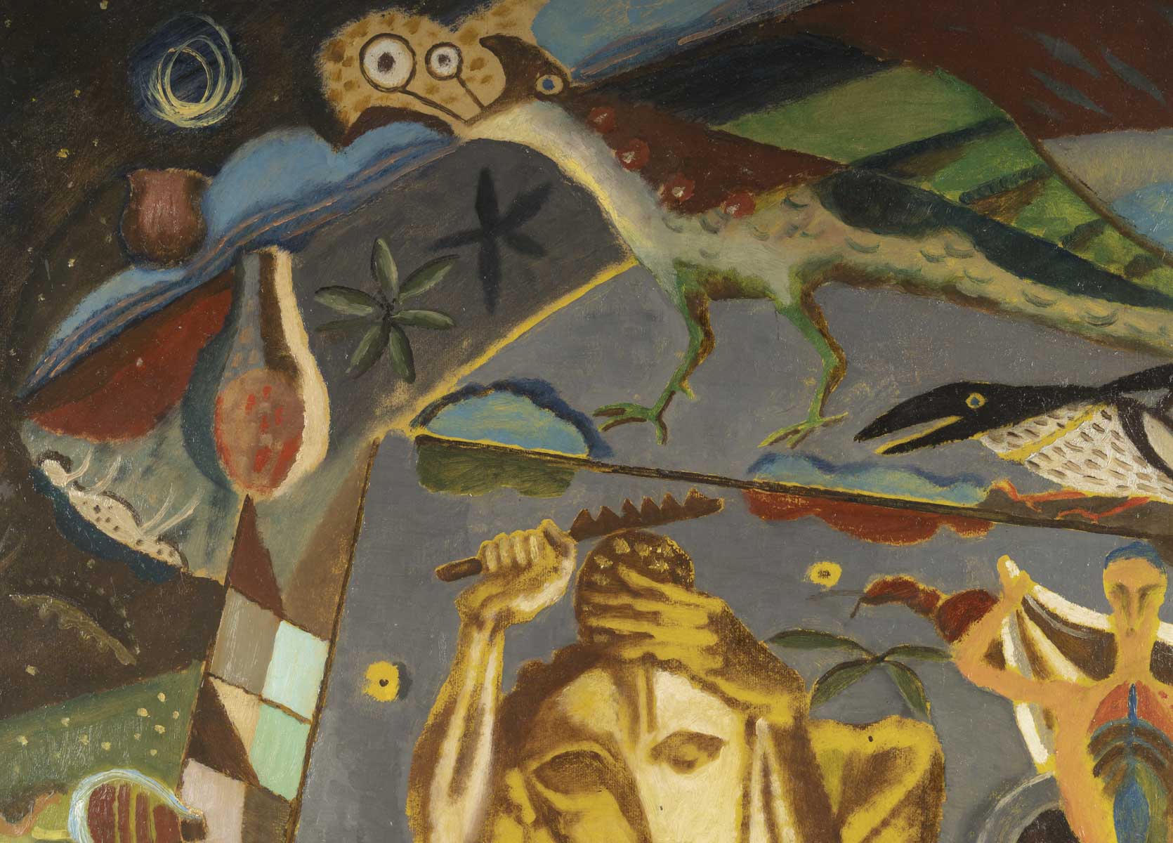 A surrealist work by Dutch painter Kristians Tonny, created in 1927. A highly charged, dreamlike composition featuring human figures, birds and oversized insects.