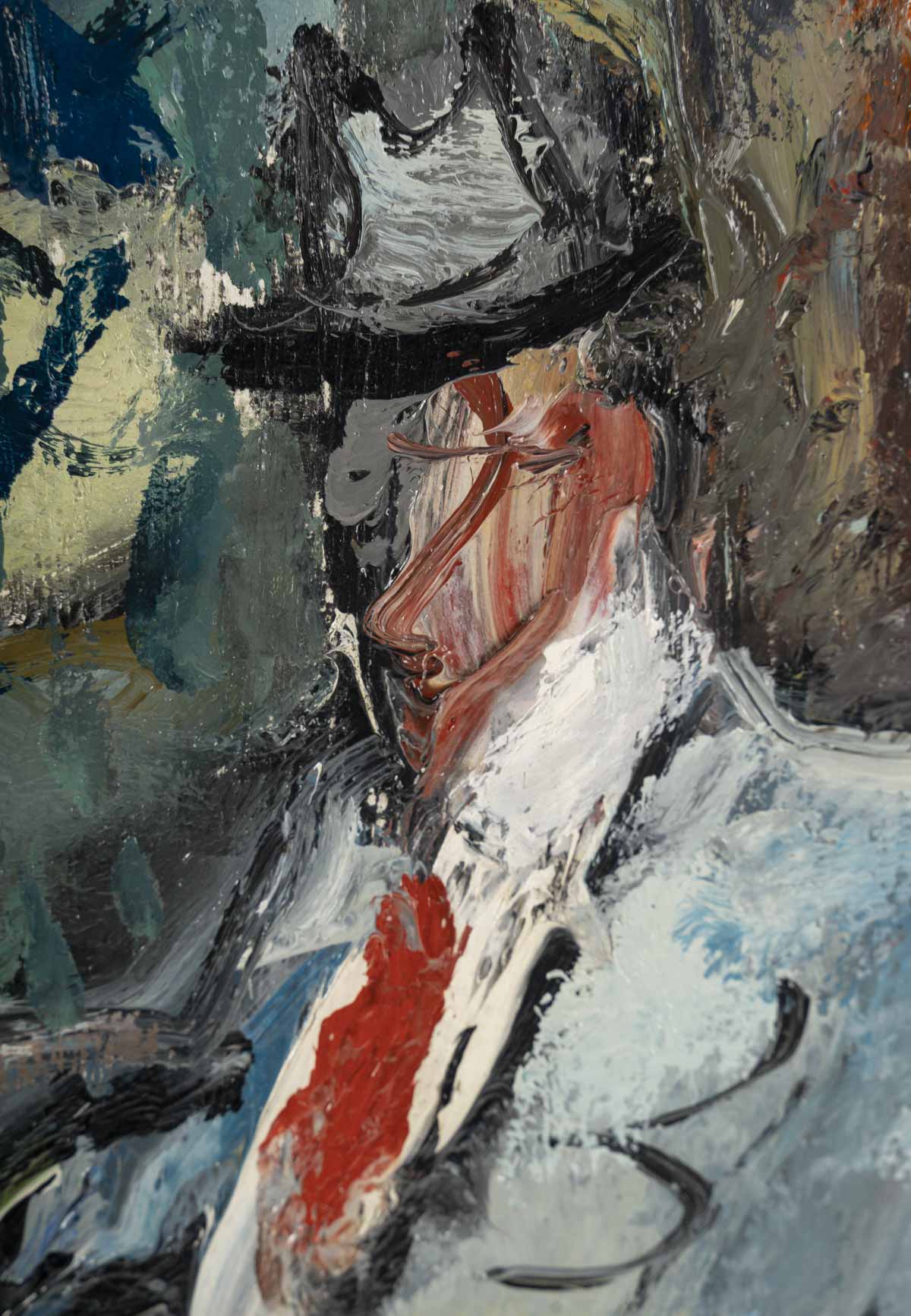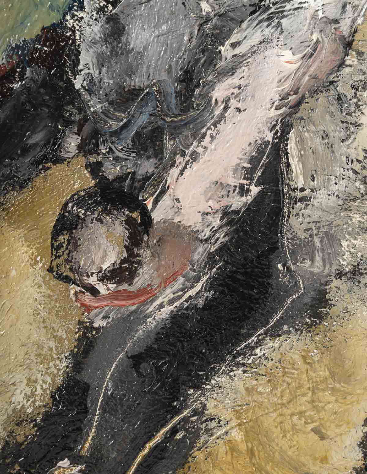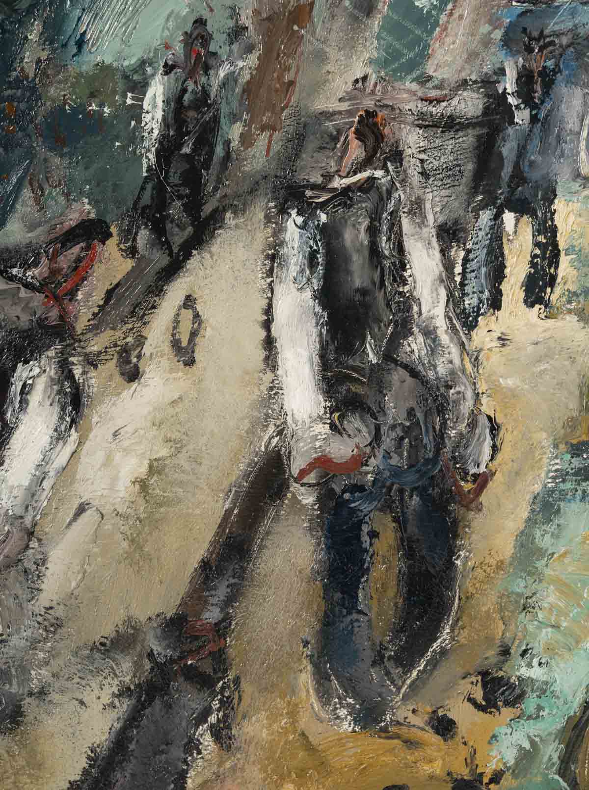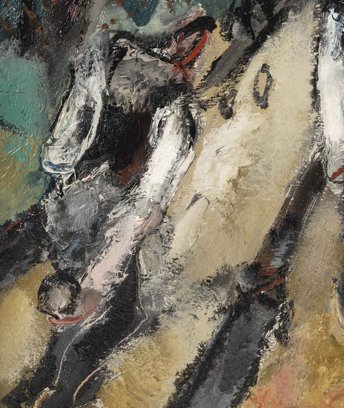 Dans notre tableau, sa touche appliquée au pinceau mais aussi sculptée et grattée donne vie à la scène de manière dynamique.