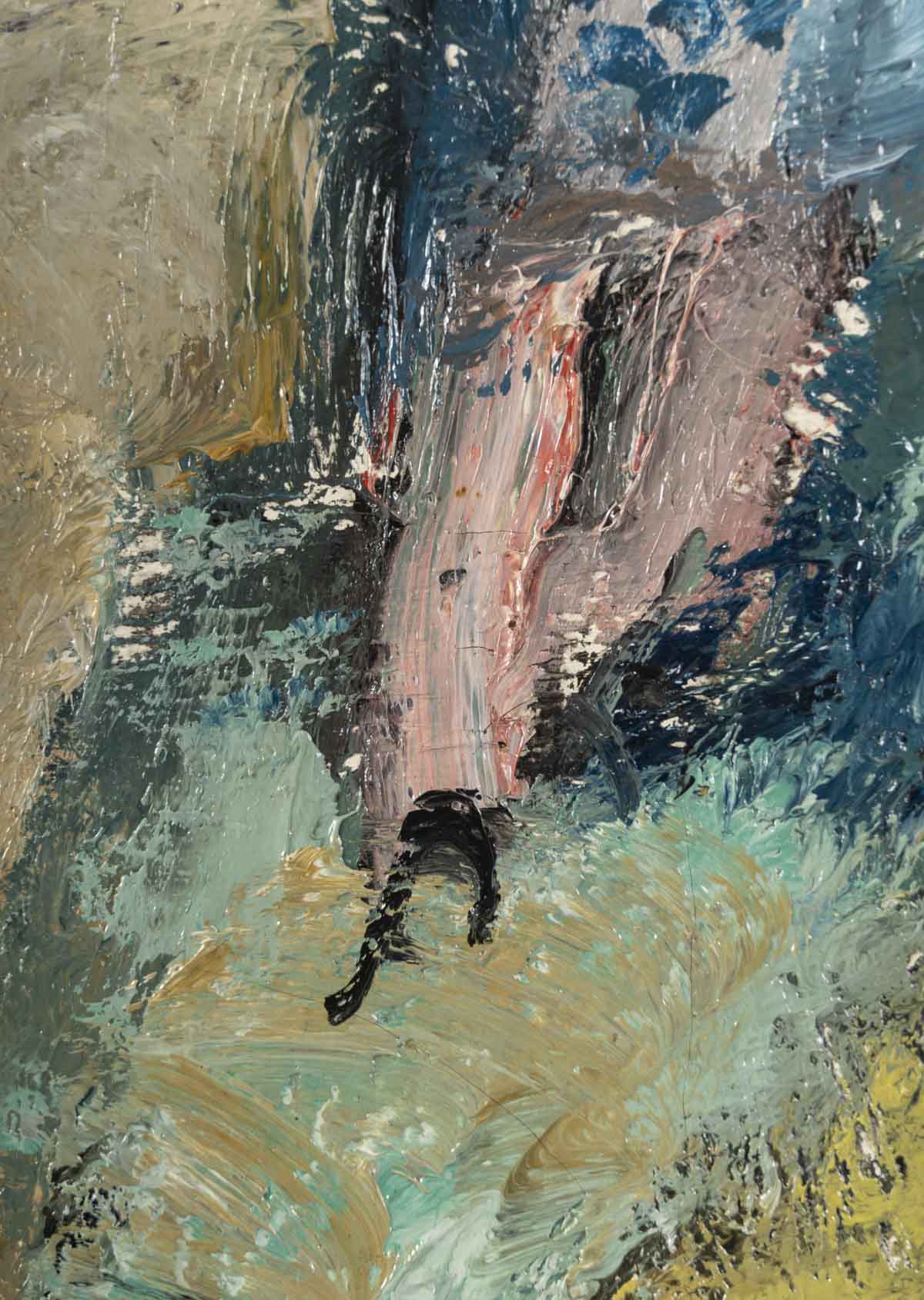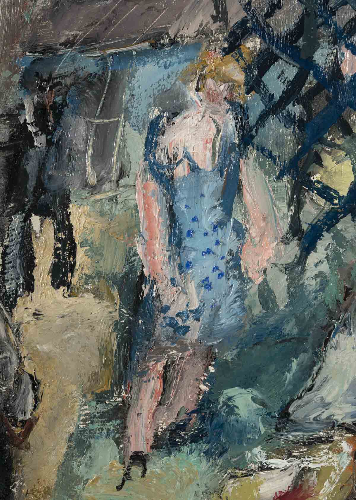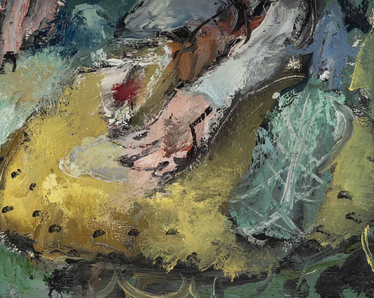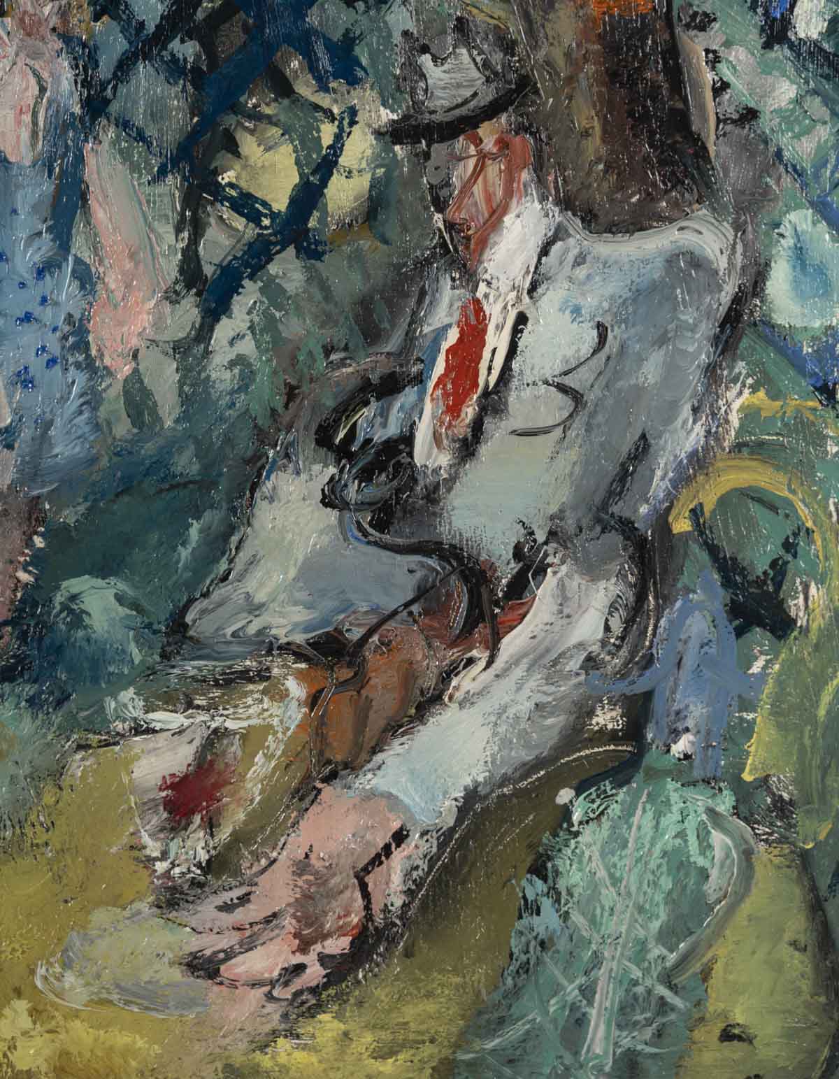 Dans notre tableau, sa touche appliquée au pinceau mais aussi sculptée et grattée donne vie à la scène de manière dynamique.