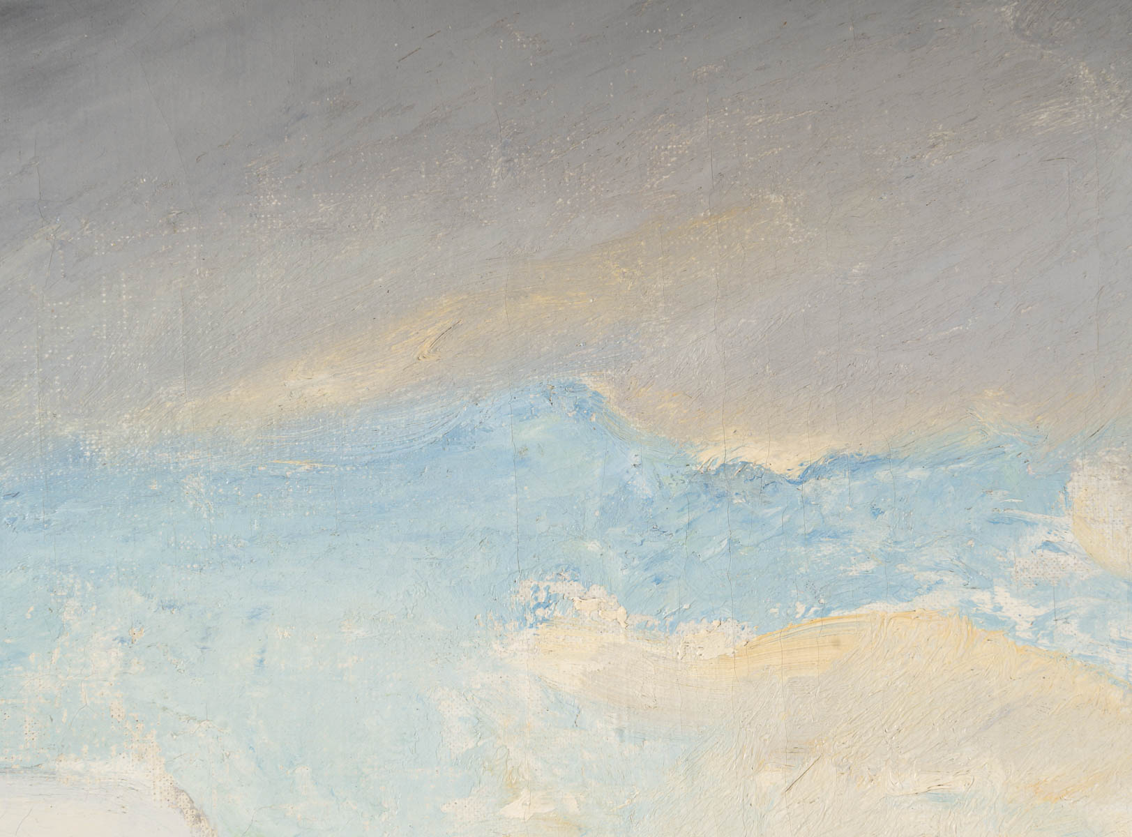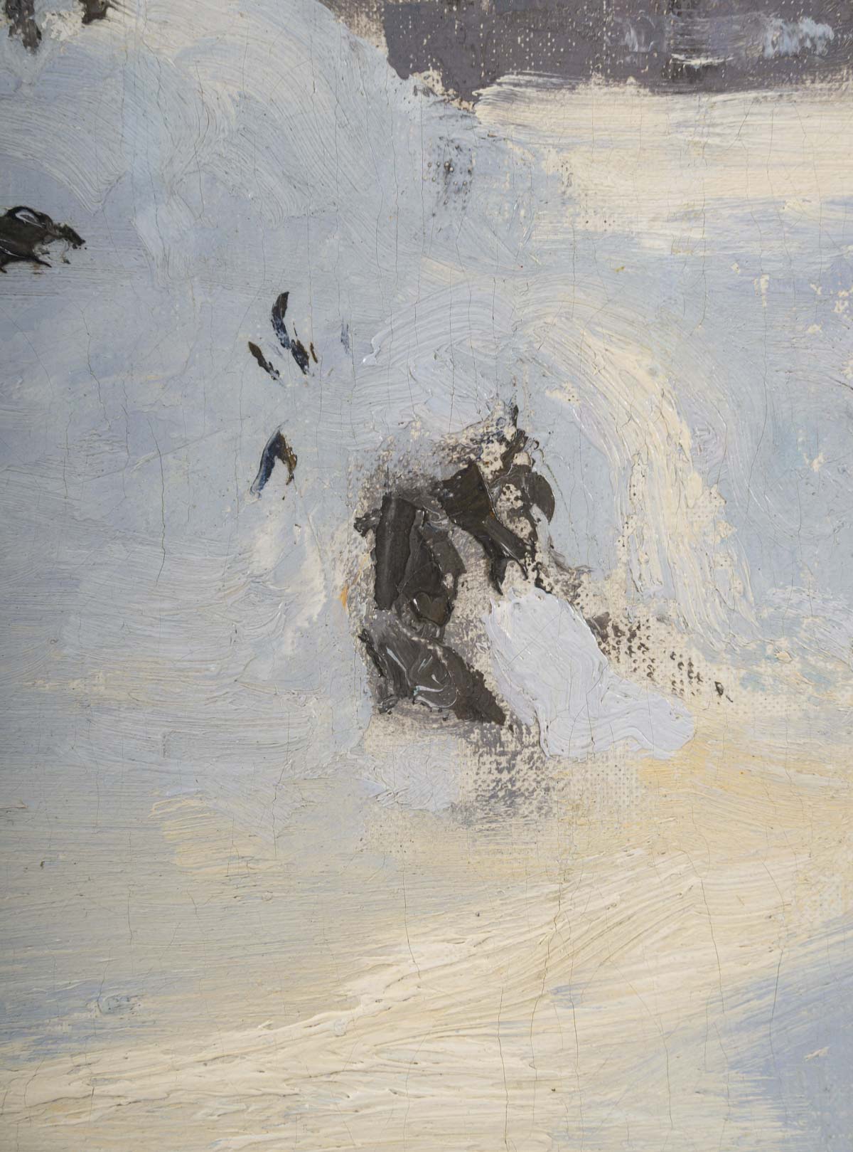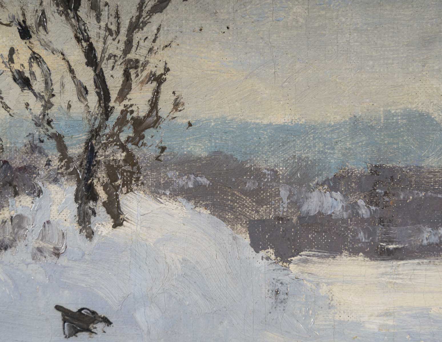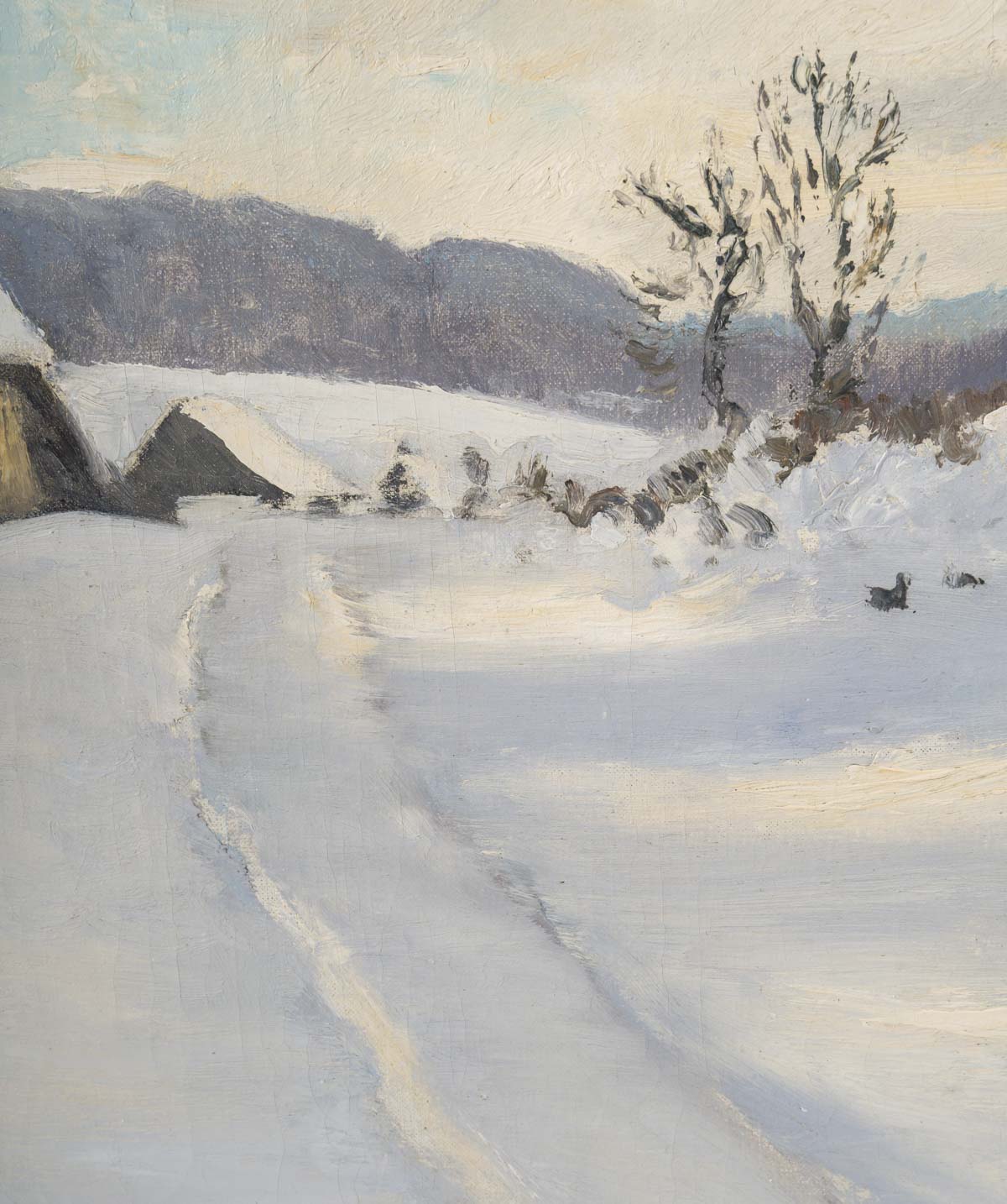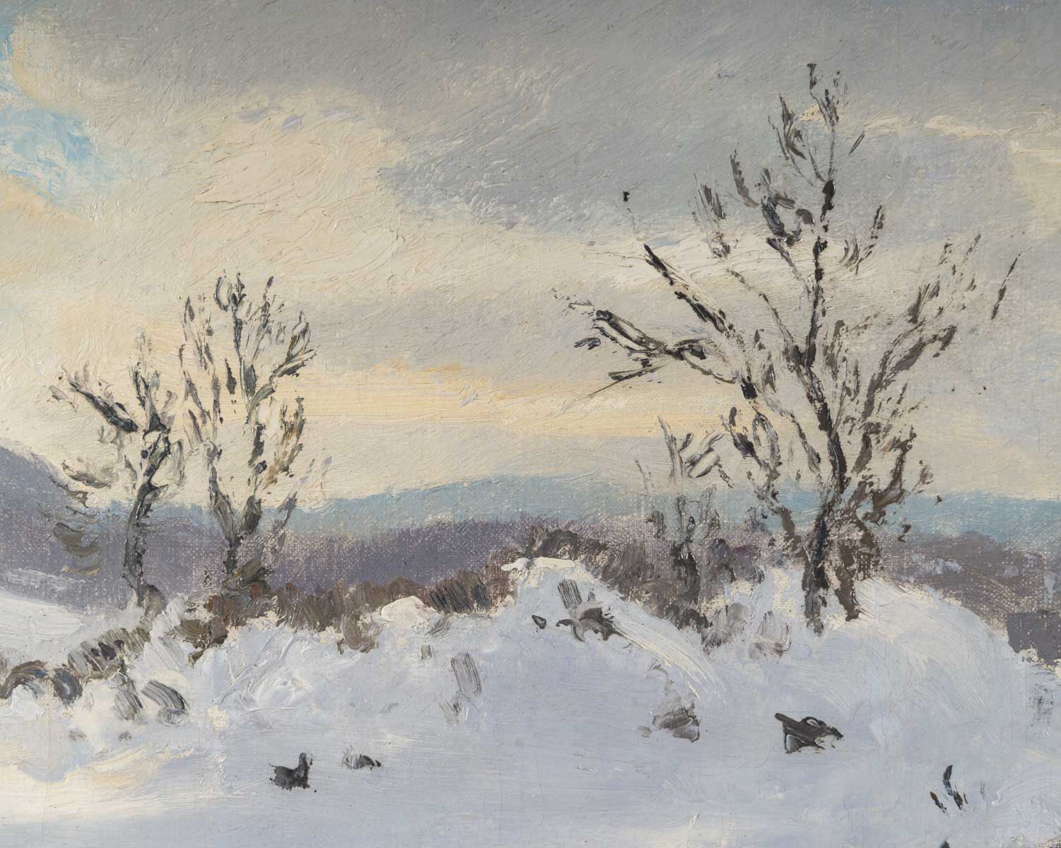 Ici le paysage est vide de toute présence humaine. Nous sommes plongés dans ce paysage troid, pur et silencieux. Une trouée de ciel bleu dans le ciel nuageux vient illuminer par endroits le manteau neigeux. Sa touche est d’une grande modernité à la fois légère et onctueuse.