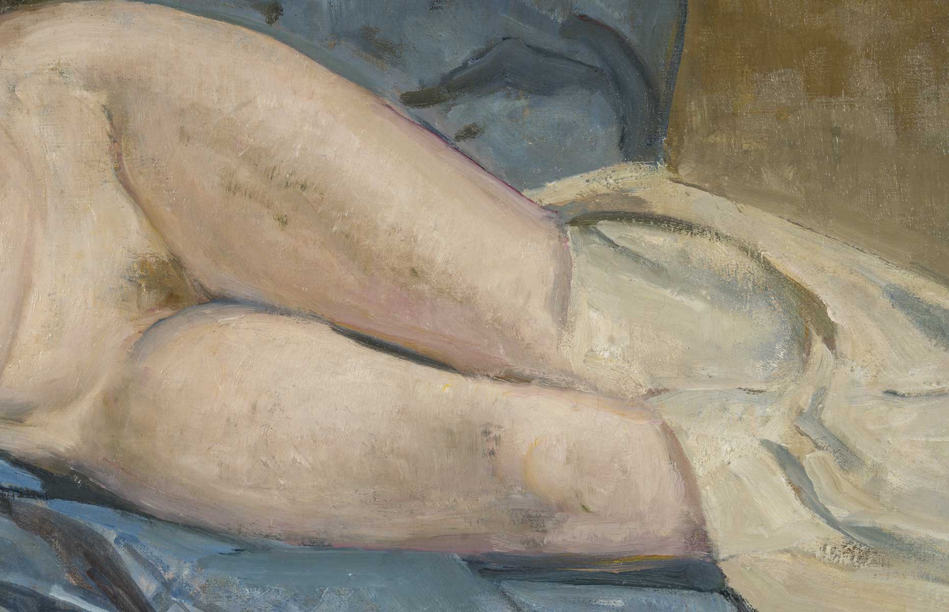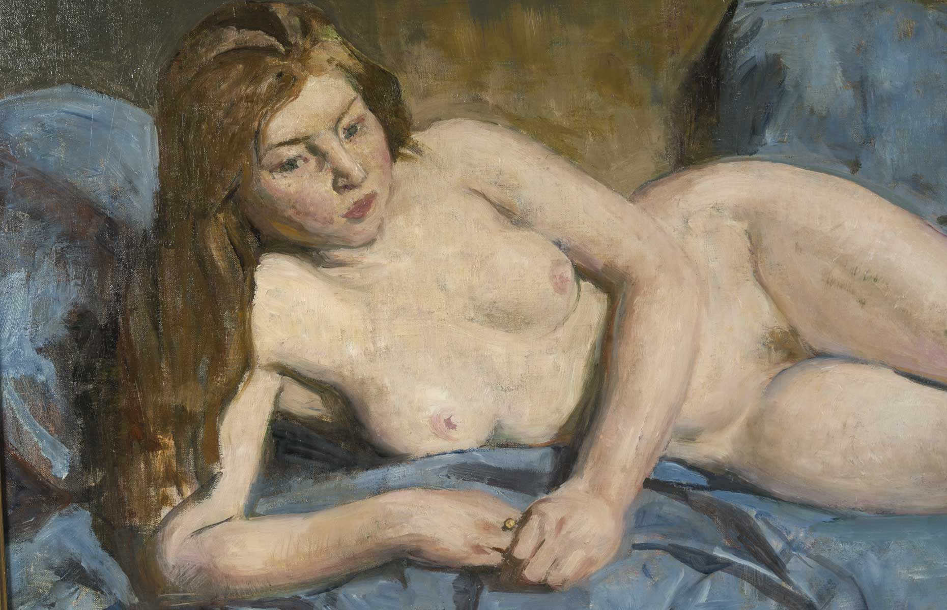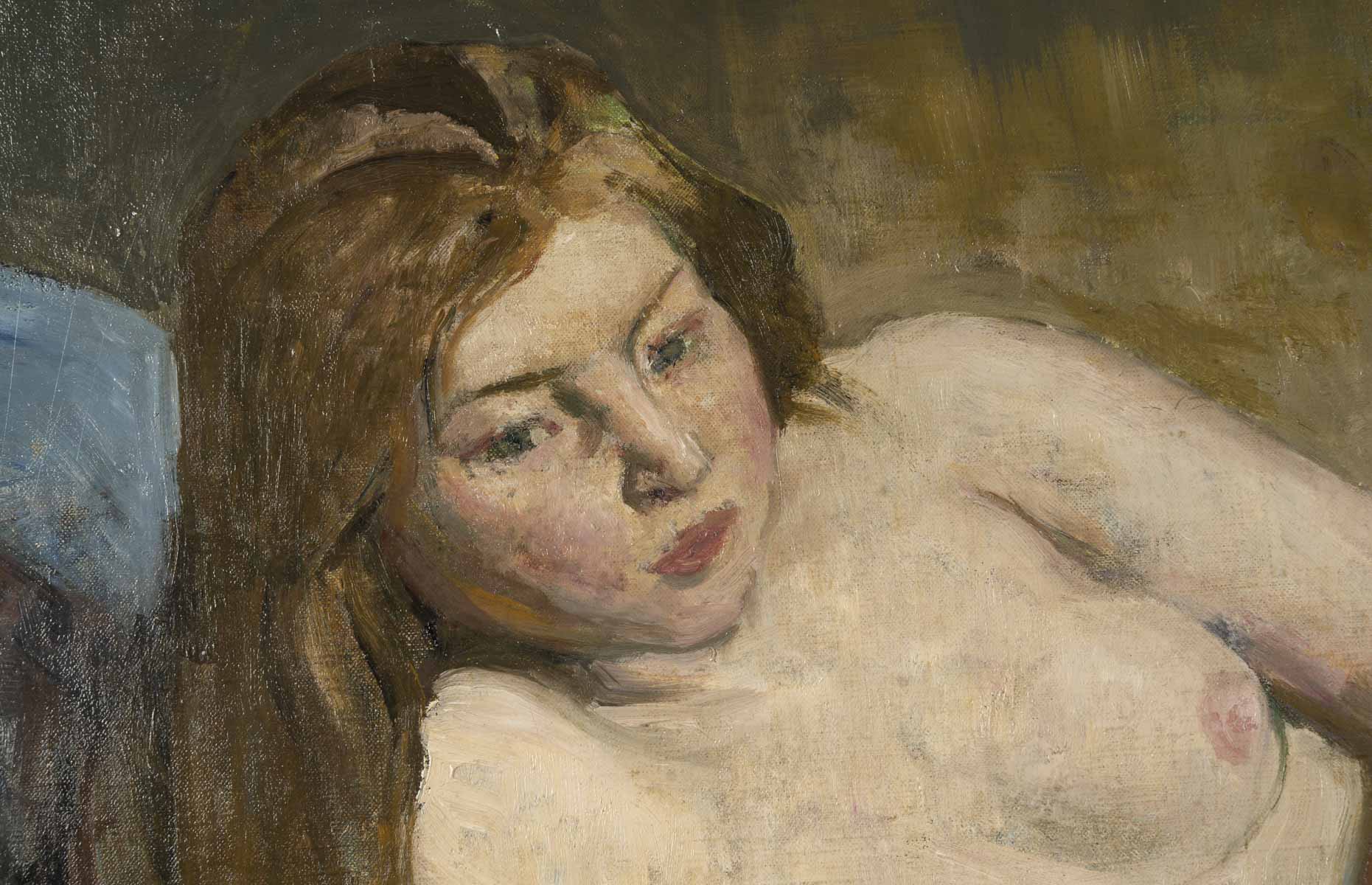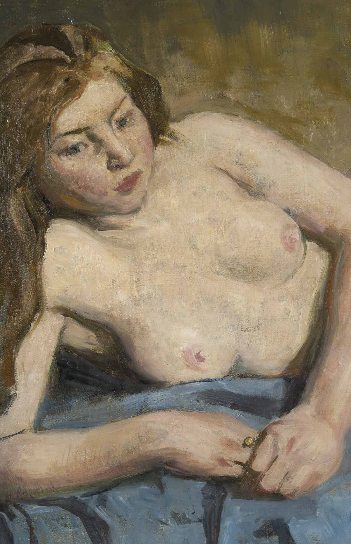 Son jeune modèle, à la longue chevelure blonde vénitienne, prend la pose. Allongée sur le côté, elle repose sur une étoffe bleue au drapé structuré. La touche est enlevée et sculpturale.